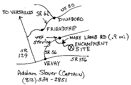 Willkommen! (welcome) to the first annual NMLRA Primitive Shooter's Encampment. The site is 3.5 miles from Vevay, Indiana (Switzerland County) which is a historic Ohio River town from Vevay just go east on SR 56 to Mt. Sterling and turn east onto Mary Lamb Road, following it the 0.9 miles to where it ends at Keener View Farm. There will be signs on SR 56 at Mary Lamb Road. Vevay is about a 30 minute drive south from Friendship (SR 129 south takes you into SR 56 at the river). Once at the site, the encampment is on a high promonotory, looking down Plum Creek Valley to the Kentucky River hills four miles to the southeast. All events and services will be conveniently located in the woodlots surrounding the encampment. Bring your cameras in a canvas bag and sneak in some modern day memories of these spectacular Ohio River hills (the Shawnee word for the Ohio is translated ``beautiful river''). Come see why these Native Americans felt so strongly about their river.