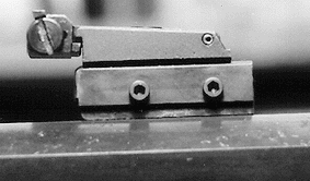 The photo above shows the complete sight base system mounted on the barrel. At left, all three parts are shownsolid base, shaped sight base, and sight.