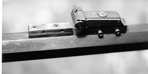 As the photo shows, this sight base system consists of three parts: the base (3/8" square stock), the top or sight mounting base (½'' square metal tubing), and finally the sight itself. The sight used here is a Thompson/Center open sight with a square notch. However, just about any adjustable rear sight could be used.