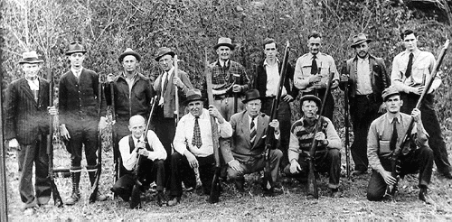 Some early founders and members of the NMLRA lined up for this 1939 photo. E.M. "Red" Farris is on the far left, front row; next is "Bull" Ramsey of Portsmouth, Ohio; Bill Large, the famous barrel maker from Ironton, Ohio, is on the far right, front row. Back row: Third from the left is Claude Turner, gun maker from Ohio; center (in plaid shirt) is Boss Johnson, a 1930's radio personality and the third president of the NMLRA.