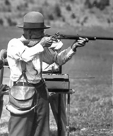 This photo bridges a span of time that saw muzzle loading become a major shooting sport. Some modern-day participants adopt this style of garb when attending traditional-style shooting matches. The shooter in the photo is identified as Elmore Light.