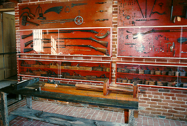 Inside the brick structure are a number of guns made by Jonathan and four generations of his posterity. |
