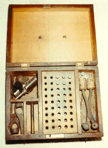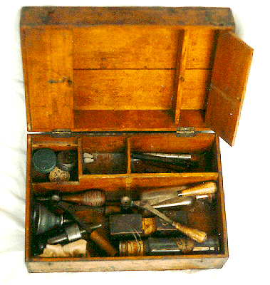 Serious target shooters invariably need to haul an assortment of tools and accessories to the range. Most of us have adapted fishing boxes or tool boxes to the purpose, and some shooters have made or purchased wooden boxes made expressly for their needs. The use of shooting boxes is not unique to present-day shooters, as the accompanying photos of two nineteenth-century specimens will attest. Both boxes appear to date from the heyday of the American muzzleloading target rifle, i.e., the third quarter of the last century. The accessories present in each box tell us a little about the rifles with which they were used, and even convey a smattering of the personality of the shooters. I wager that the contents of our shooting boxes and possibles bags today reveal more than a little about our shooting pursuits, tastes, inventiveness, and skill with tools. I'll inventory the items found in each box and follow the lists with detailed plans so that anyone with a few simple hand tools and a desire to own such a box can fashion a precise copy.