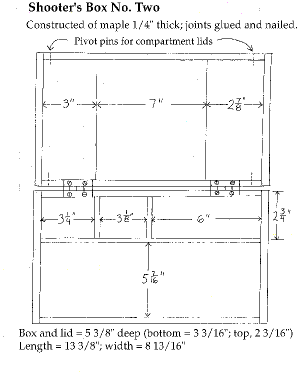 Please note that the dimensions I provide were obtained by measurement of the antique boxes. Both have experienced some stress over the past century and a quarter, so you might want to allow an extra thirty-secondth of an inch on some dimensions and carefully trim to fit the pieces together. These boxes might serve merely as inspiration, and you can incorporate any changes you wish. On the other hand, if you prefer an exercise in duplicating a documented, 100-percent historically correct shooter's box, you can follow the plans to the letter. Good luck and good shooting!