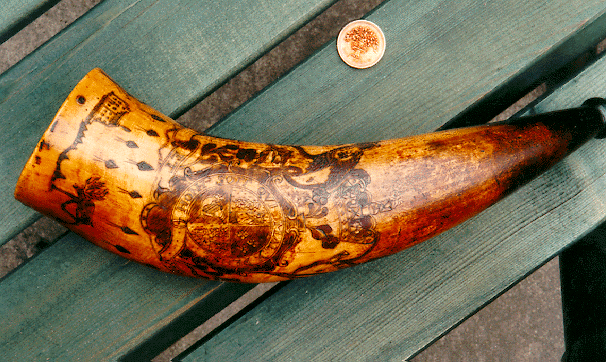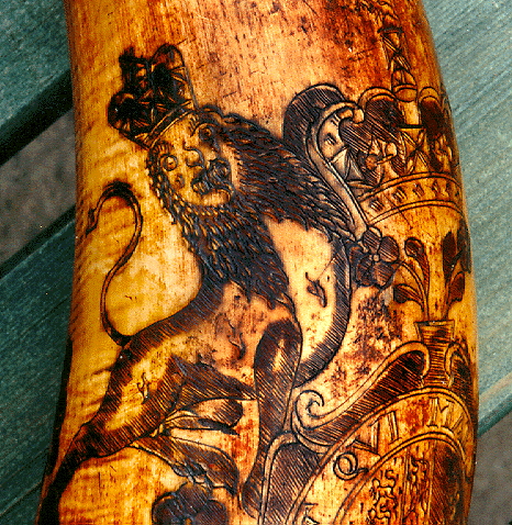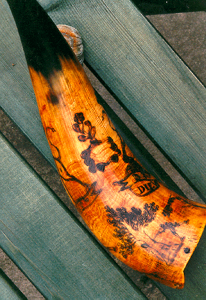 Individual makers of horns are difficult to identify because few of them signed their products. But surviving horns can be attributed to the same hand by comparing details of design and calligraphy. Distinctive features on my horn include the lion's face, spear-point trees, and the deer. [Editor's Note: Alert students of antique horns will detect a clear connection between the author's horn and the work of the "Pointed Tree Carver" documented in The Engraved Powder Horn by Jim Dresslar and David Wesbrook (Bargersville, IN: Dresslar Publishing, 1996); see specifically pp. 23, 111, and 113.] This horn also bears some unskilled engraving presumably added by its owner: a couple of trees and the word Dieu enclosed by a snake.