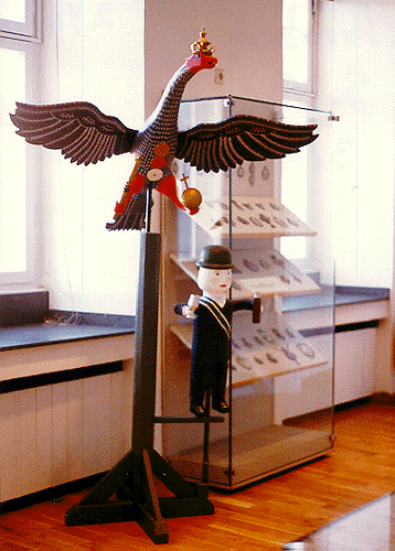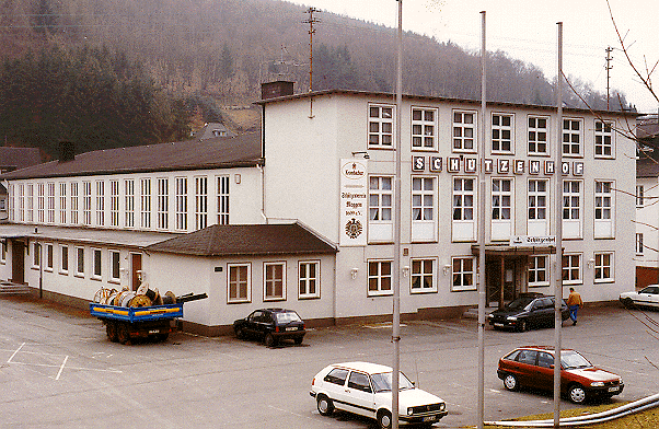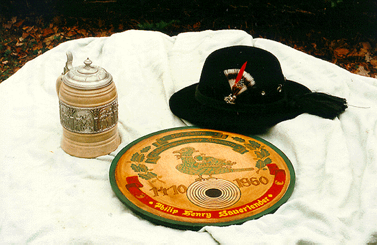 I have enclosed for your use copies of the pictures I took. The modern Schuetzenhalle in Eslohe is particularly interesting. There is a large mural to one side which shows many interesting details of the flags, targets, patron saints, etc. I saw signs suggesting that these halls were being used as general purpose sports auditoriums, but it was clear that shooting was the main emphasis. Another picture I have shows Dieter Weiss painting my name on the Schuetzen Scheibe. In Finnentrop I found a target box on the hillside. Mr. Weiss said that the bird target is mounted inside and is hoisted up in the air to be shot at. The back of the box was lined with foam board and the holes were approximately a half-inch in diameter. If you look carefully, there is an Easter Cross on the background. This will be set on fire Easter evening. Finally I took pictures in the Sauerland museum in Arnsberg and the Burg (castle) Altena. Both had interesting Schuetzen club exhibits. The pamphlet is from the Schuetzen club museum in Attendorn (unfortunately closed for the season). It is located in one of the two remaining Medieval wall towers.