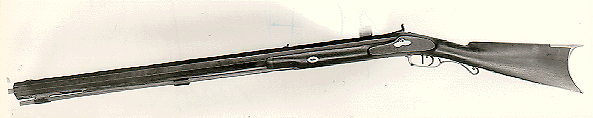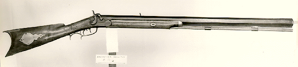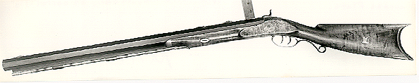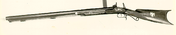 Rifle No. 59 is a maple half stock with back-action lock, brass mountings, and double-set triggers. The key escutcheons and an eagle inlay on the cheek side of the buttstock are silver. The nosecap is pewter. The barrel is 32 inches long, 1 5/16 inches across the flats, and is approximately .54 caliber with six- groove rifling. This is the same rifle described in Charles E. Hanson, Jr.'s book The Plains Rifle on page 89.