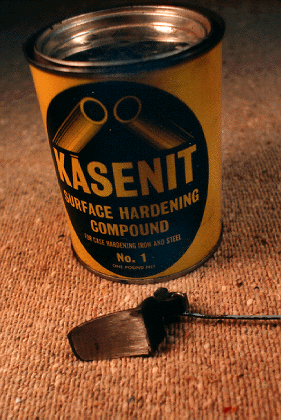 The condition of the frizzen is very important to how many sparks are produced with a sharp flint. If the frizzen looks like a "washboard", breaks up the edge of your flint, or doesn't throw many sparks, it is time to clean up the face of the frizzen and reharden it. The procedure that I use is very easy. I have heat treated over a hundred frizzens with this method. The items you need are: One wire clothes hanger; "Kasenit" surface hardening compound; Two quarts cheap 30-weight motor oil; one quart cheap automatic transmission fluid; and two propane torches (one will not generate enough heat).