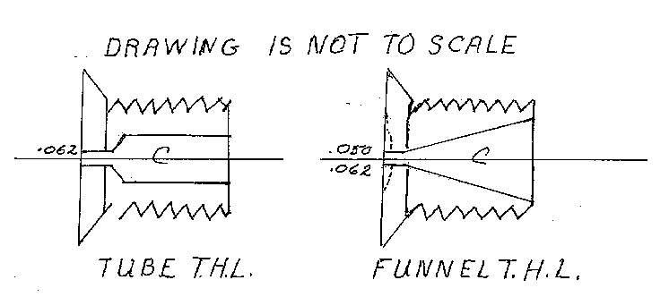 When I make a liner, I want a funnel-shaped interior (see the drawing) and not a tube. Think about it: stuff will go into a funnel easier than into a tube. After I drill the diameter hole that I want, I use a cone or "Christmas tree" shaped carbide cutter to shape the internal part of the liner to a funnel shape. After the liner is installed in the barrel, I put a shallow cup in the outside face of the liner with a ball type carbide cutter. With this type of liner I can usually see powder grains in the touch hole after loading the rifle. I don't "pick" the hole before shooting, and flashes in the pan are very rare. The internal shape of the liner appears to create a self cleaning action. The ignition is super fast, and I have not had a liner blow out.