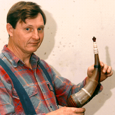 A smiling Jack holds up a horn that has just been turned and threaded. Notice that what the horn turner has established is two finished dimensions. Now all Jack needs to do is remove everything between that is extraneous.