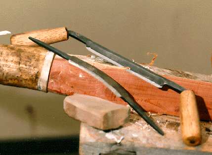 As we examine the tools Jack is honing, we are bemused by their commonness. Surely one would not attack this entire pile of horns armed with nothing more than a small draw knife and a curved scraper! Yet close examination does not reveal familiar names such as Ryobi, Rockwell, Dewalt, Makita, and Sears. Perhaps it would be best to see if Jack knows something that any one of us could put to use in our own shop.