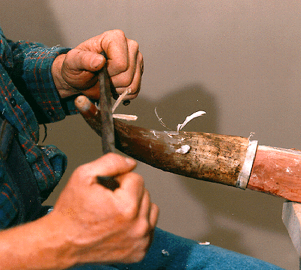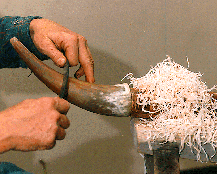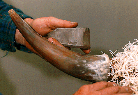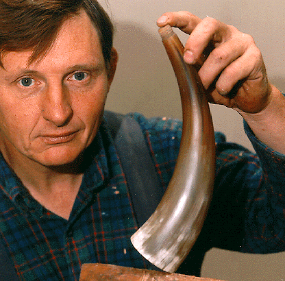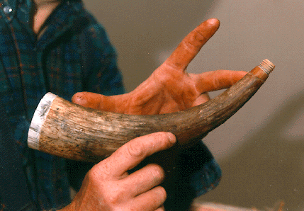 This picture shows the horn swaged over a tapered form held in Jack's horn press (a common vise will do). Although you can't see it, there is a resolute yet winsome expression on Jack's face. There is a twofold reason for this expression. One is that his tools are sharp, and the second is a long-hidden piece of horn knowledge that can render all horns submissive to your efforts: the growth grain on horn is like a flipped stack of paper cups.