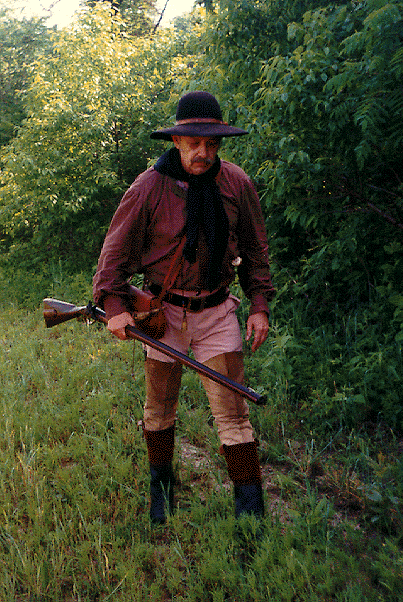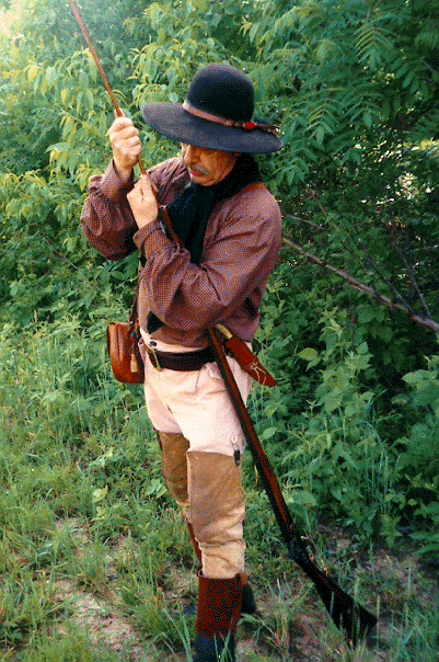 You'll also note that by grasping the forestock with your left upper arm, both hands are free to load the rifle. Your measure should be on your bag strap and your powder horn accessible to your right hand. Pull the horn stopper with your teeth and pour out a measured charge. Don't forget to put the stopper back in the horn. Now pour the powder down the muzzle.