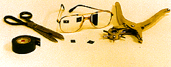 I've been using these pin-hole reading glasses for shooting for many years. There have been some questions and comments about their odd look (though they are not real conspicuous). I've even heard some grumbling (from grumblers) at primitive events about my using "modern" or "optical" sight aids. Well, I agree that the plastic tape has no place in an ultra-primitive event, and it doesn't have to be there. The first pin-hole glasses I made, years ago, were made by soldering a drilled piece of copper into the corner of an antique granny-glasses frame with no lenses in them. And for purists, old- style frames could be fitted with the needed front sight diopter lenses.