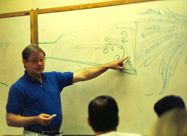 Wallace Gusler and Gary Brumfield presented an intensive class on drawing techniques as specifically related to designing rococo carving and engraving for patchboxes and cheekpieces. Dozens of color slides of beautiful rifles (many of them never seen before except by a few collectors) were copied in minute detail so that students could begin to understand how sophisticated and subtle much of this ornamentation really is, and could take home a catalog of designs for their own use.