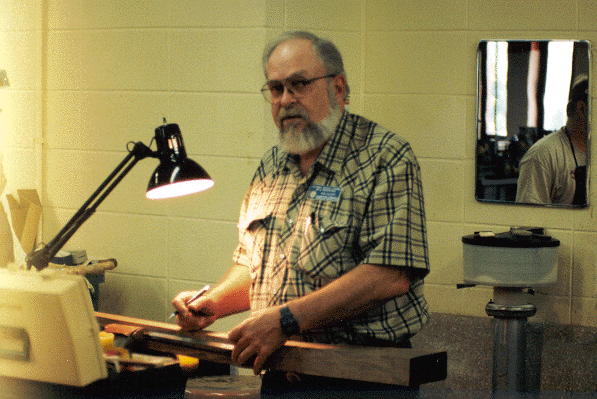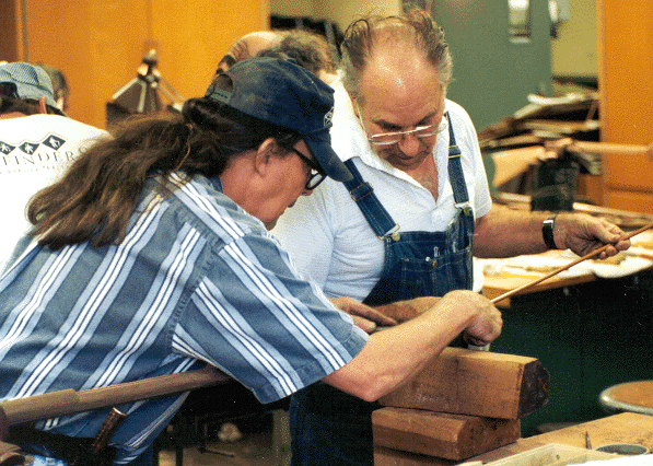 Wallace Gusler, recovering from a newly acquired broken ankle, taught his class the techniques associated with ornamental carving of an American longrifle. From tool sharpening to drawing to shop set up and lighting, all the tricks of the trade associated with this demanding aspect of gunmaking were presented by the Master of the Gunshop at Colonial Williamsburg. At the end of the course, students took home a "Quaker gun" covered with correctly designed and executed carvings to use in their shops at home, as well as a large tool kit of new skills and a good working knowledge of the "vocabulary of ornament" used on 18th-century rifles.