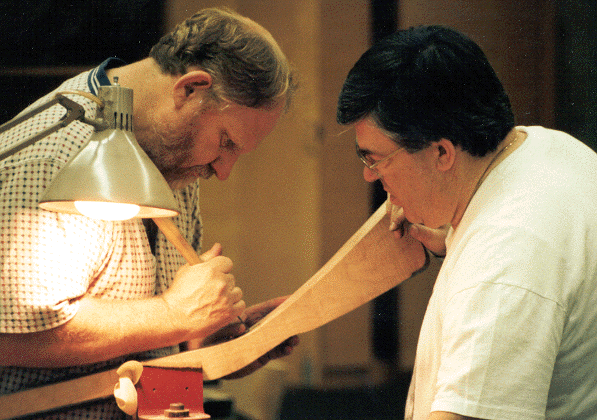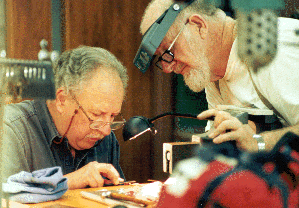 Mark Silver (left) and student Ed Willis sharpening a graver. |