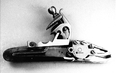 I used an unfinished pistol already inletted with a Russ Hamm lock (Fig. 7) made in the 1960's. The assembly
